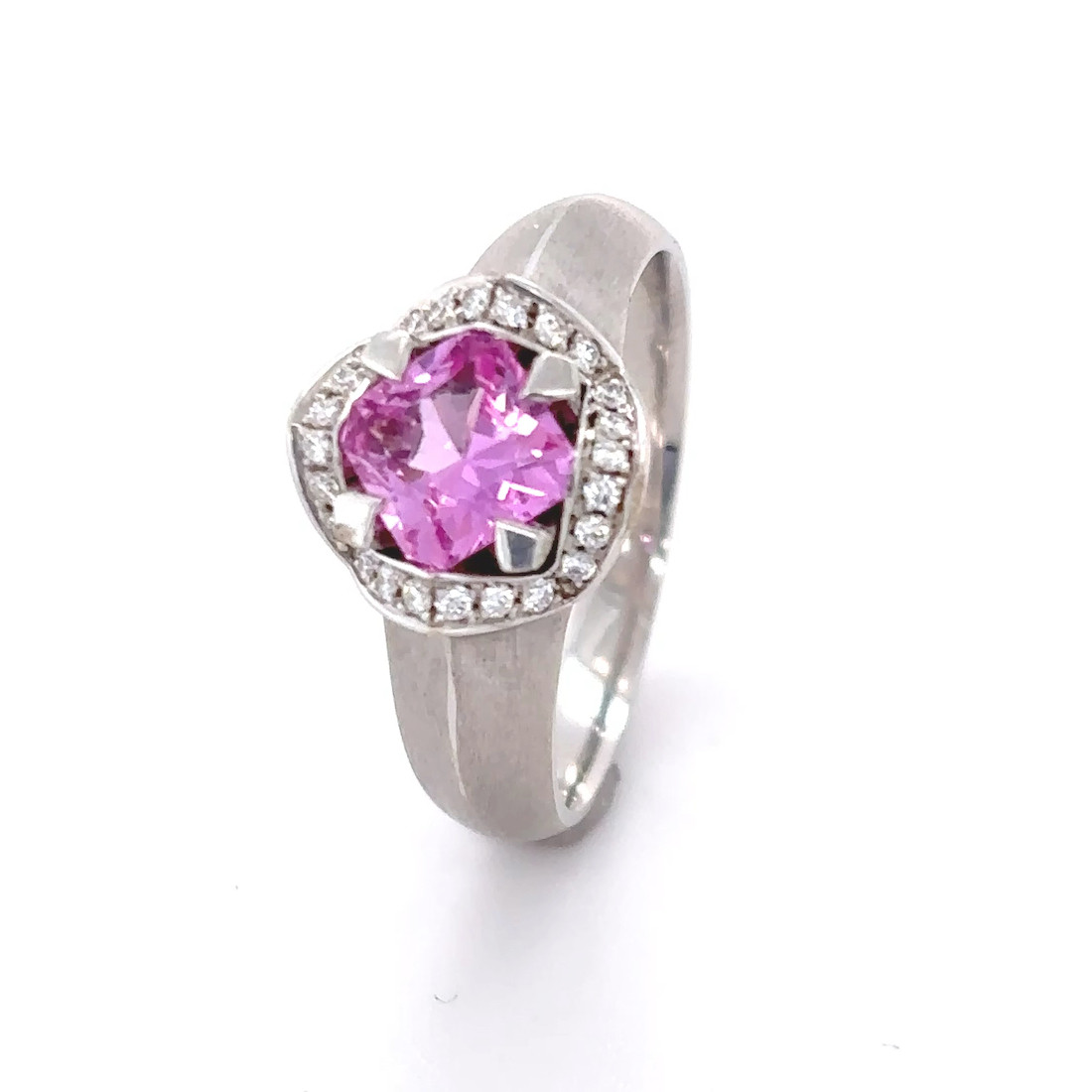 materiál: bílé zlato, váha: 6,35g kameny: růžový safír= 0,85ct 24ks diamantů: 0,10ct VS1-E