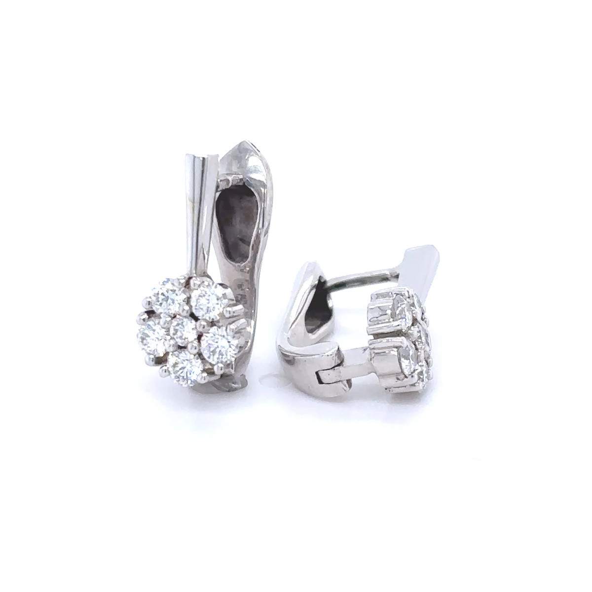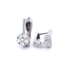Jemné náušnice z bílého zlata osazené zářivými diamanty tvořící kytičku. Precizní brusy kamenů dodávají náušnicím třpyt a lehkost. Vylepšené klapacím ale ladným uzávěrem.