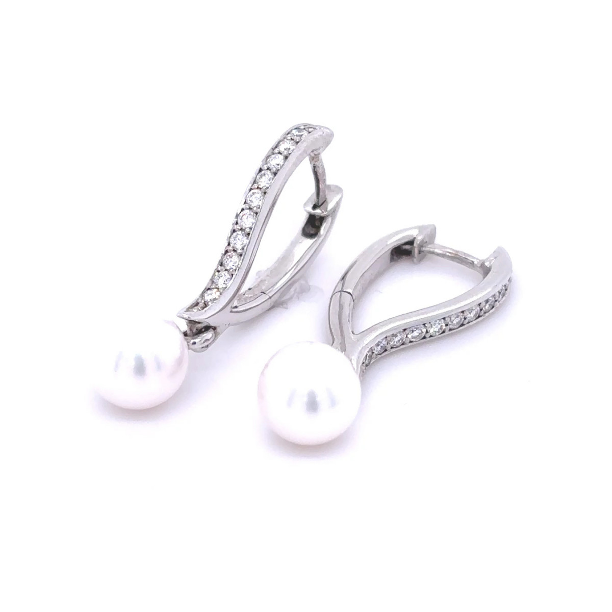Náušnice z bílého zlata osazené malinkatými diamanty. Mají elegantní tvar a ve spodu zavěšené černé tahiti perly.