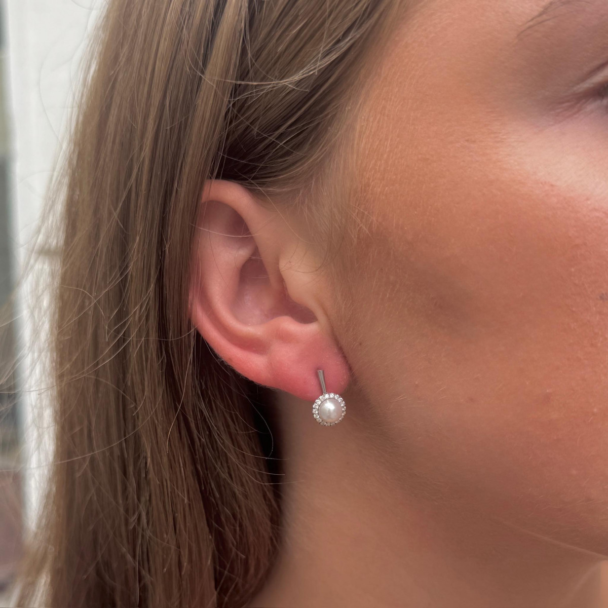 Náušnice z bílého zlata s bílou perlou uprostřed obklopenou jemnými diamanty. Kombinace klasické bílé perly a třpytu diamantů.