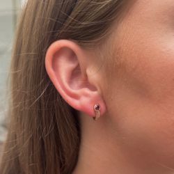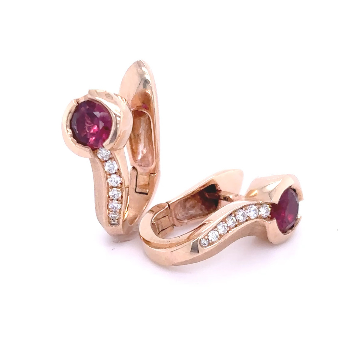 Elegantní náušnice z růžového zlata s rubíny usazenými v asymetrickém tvaru, po stranách se 7 diamanty na každé náušnici