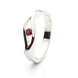 Jemný prsten s českým granátem uchyceným mezi dvěmi tenkými liniemi bílého zlata tvořícími "vlnky". Při tomto usazení může vyniknout celý průměr českého granátu.