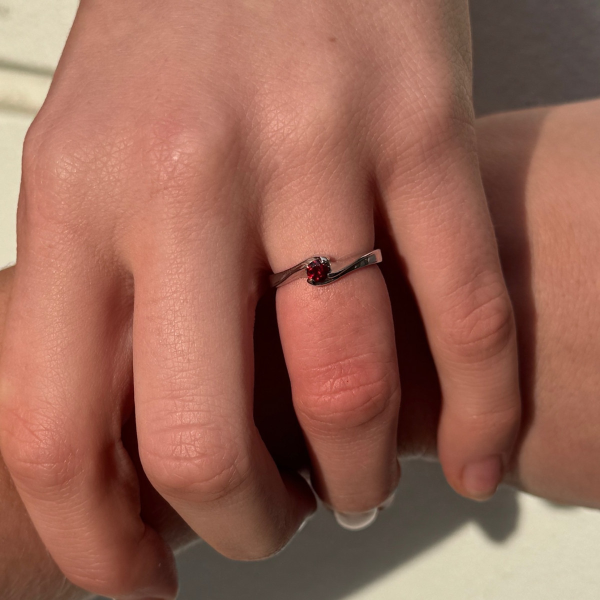 Prsten s českým granátem usazeným v asymetrické korunce znázorňující vlnky, které vystupují z obroučky prstenu.