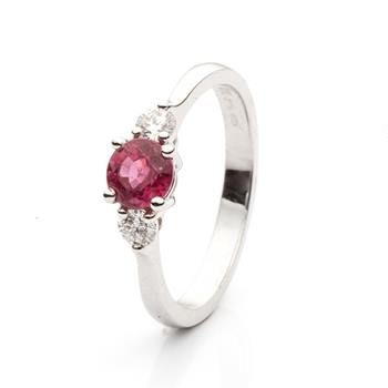 Prsten z bílého zlata s přírodním červeným rubínem. Bílé diamanty po stranách umocňují sytě červenou barvu rubínu. Tento model je také vhodný jako zásnubní prsten.