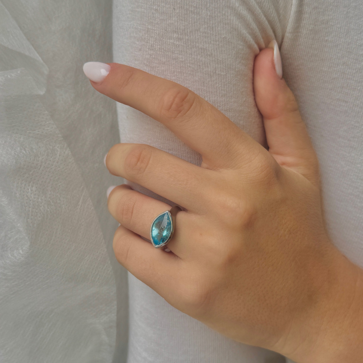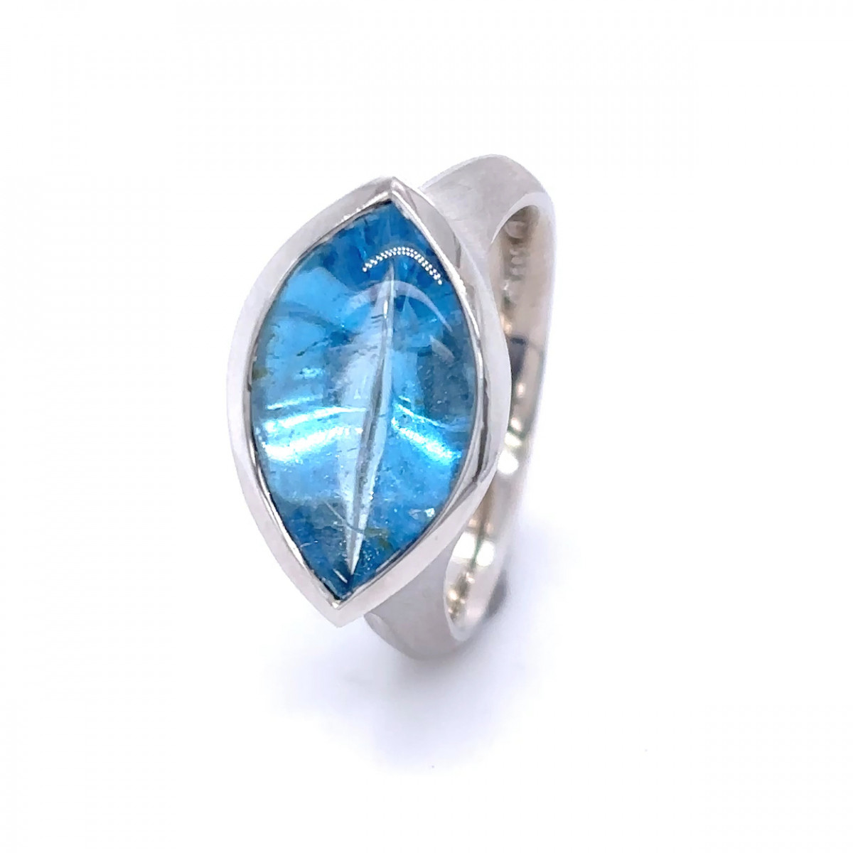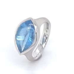 Moderní koktejlový prsten s leštěným Aquamarínem. Na ruce působí výrazným dojmem avšak na ruce je pohodlný.