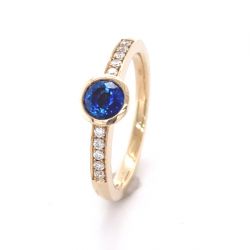 materiál: žluté zlato, váha: 3,30g kameny: modrý safír= 0,60ct 10ks diamantů= 0,15ct SI1-F