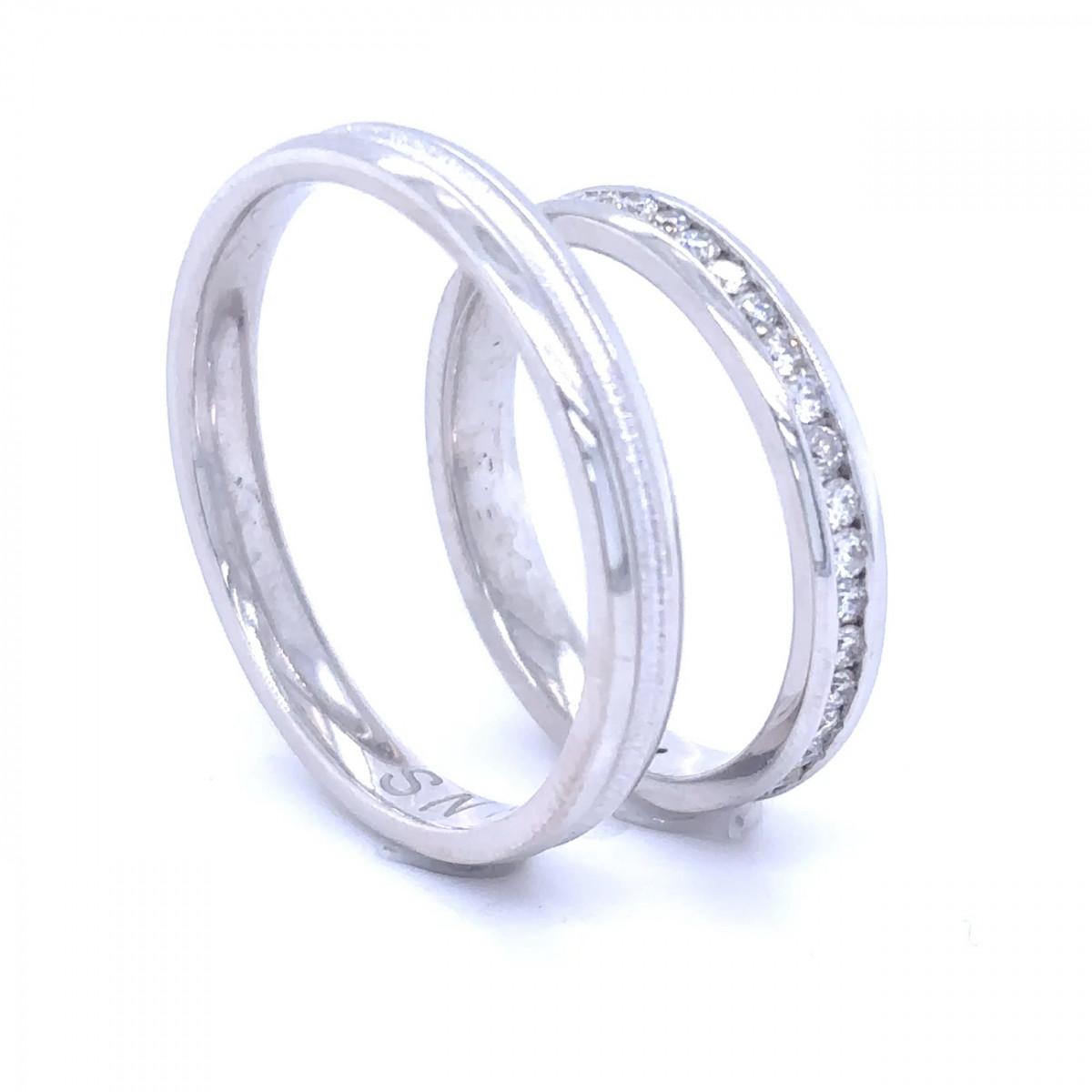 Tyto decentní praktické snubní prsteny jsou široké 3,00 mm. Mají půlkulatý tvar a v pánském prstenu je po celém obvodu matovaná prohlubeň. V dámském prstenu jsou v této prohlubni usazené diamanty po celém obvodu tak, aby byl prsten hladký a nikde nazachytával.