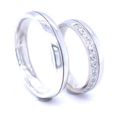 Tyto snubní prsteny jsou široké 4,50 mm , mají půlkulatý profil a jsou ve středu rozdělené drážkou. Polovina je matná polovina lesklá. V dámském prtenu jsou za sebou zasazené drobné diamanty v jemném pavé setu ( do krapniček)