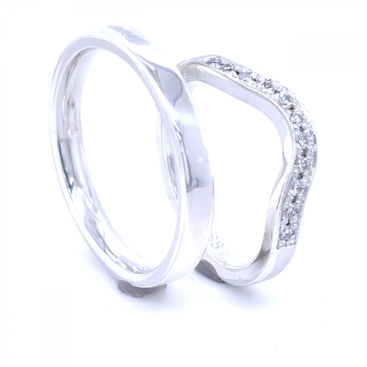 Snubní prsteny z Platiny jsou vhodné pro nošení se zásnubním prstenem. Jsou široké jen 3mm. Dámský snubní prsten s drobnými diamanty je vybočený do vlny přesně podle korunky daného zásnubního prstene. Opticky působí na ruce jakoby obtékal centrální diamant.
