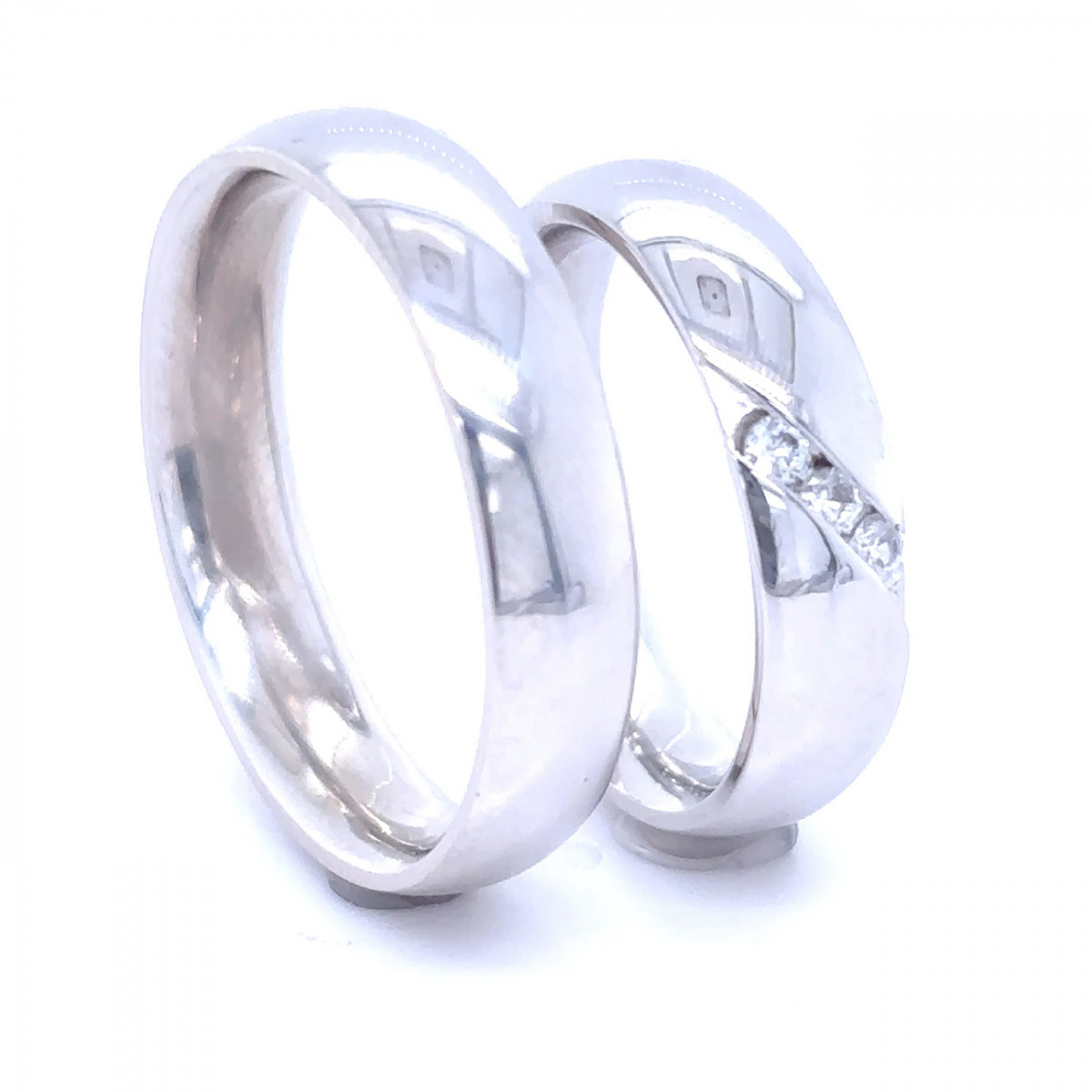 Tyto půlkulaté snubní prsteny z bílého zlata jsou široké 5,00 mm. V dámském prstenu jsou napříč zasazené drobné diamanty. Působí velmi elegantně.